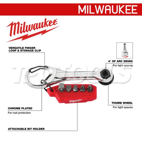 ประแจขันอเนกประสงค์แบบ 7-in-1 Multi-Bit Mini Ratchet ของเราช่วยให้เข้าถึงพื้นที่แคบได้ดีขึ้นด้วยมุมโค้ง 4° ประแจขันอเนกประสงค์แบบ 7-in-1 นี้มาพร้อมห่วงคล้องนิ้วอเนกประสงค์และคลิปหนีบเพื่อการควบคุมที่สะดวกและการจัดเก็บที่ง่ายดาย ที่จับดอกสว่านแบบติดได้ช่วยให้เข้าถึงดอกสว่านได้ง่ายและจัดระเบียบได้ดีขึ้น ปุ่มหมุนสำหรับขันและคลายตัวยึดเมื่อมีพื้นที่จำกัด ประแจขันอเนกประสงค์แบบ 7-in-1 ของ Milwaukee®